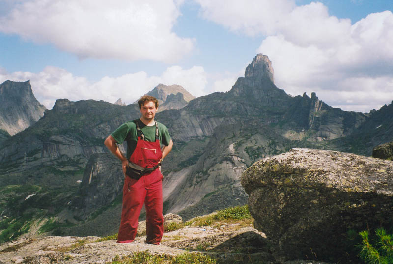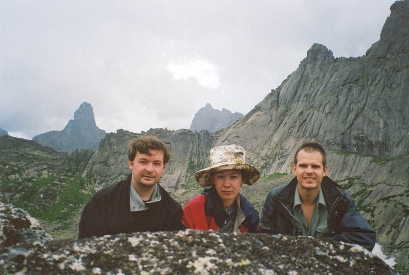 Проснулись в 7.45. Погода хорошая. Поспали еще чуток, встали в 8.30. Решили последовать рекомендации москвичей и совершить восхождение на Мать Саян. После завтрака, в 9.40 вышли на маршрут. Пошли по знакомой уже тропе в сторону пер. Сказка. На отроге пика, перед цирком, свернули с тропы вправо и пошли по склону вверх. Достигнув основного скального массива, прошли под скалами, дошли до расщелины, очень очевидной, поднялись по ней, вышли на небольшую седолвинку (типа перевальчика), обошли вершинную башню, траверсируя (около 50 м) склон уже с северо-восточной стороны, и поднялись на пик.