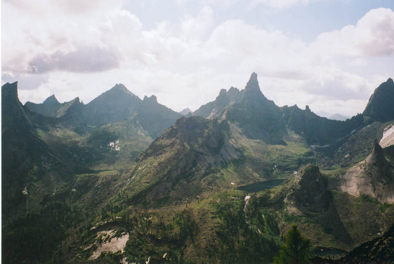 Отсюда открывается восхитительный вид практически на все Ергаки. Общее время подъема от лагеря у нас заняло 1 ч 35 мин. Отмечаем, что последние 2-3 метра, на глыбу, венчающую собой пик, подниматься лучше с нижней страховкой. Хотя скала шершавая и по сухому камню забраться несложно. Наклон 45-50 град., но зацепок нет. В лагерь вернулись в 12.40. Москвичей уже не было. Приготовили обед, собрали лагерь и в 14.30 пошли в сторону перевала Тайгиш-3 (1А, 1800).