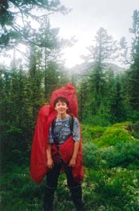 К Лазурному озеру решили не спускаться, а пересечь цирк и двигаться к склону г. Мать Саян, подсечь там тропу и далее по тропе дойти до цирка под пер. Сказка, где и встать лагерем. Но осуществить задуманное нам не удалось по двум причинам. Цирк мы пересекли, но искомая тропа, как выяснилось позже, начинается непосредственно от Лазурного озера. К тому же, и это самое главное, погода стала портиться буквально на глазах. Уже более часа в соседней долине громыхал гром, но над нами все еще светило солнце. Но тут мы увидели несущуюся на нас грозовую тучу из долины Кебежа. Это сильно не понравилось нашей команде. Развернувшись, мы ломанулись вниз по склону к стоянке у Лазурного озера. До стоянки не добежали где-то метров 50 - начался ливень. Спрятавшись под кедром с тремя стволами, заткнули щели между деревьями рюкзаками, и стали пережидать непогоду. И тут начался град (время - 17.20). Да какой - диаметром до 1.5 - 2 см! Пришлось нацепить каски - градины, как пули, пробивали даже мощный слой веток векового кедра. Град шел минут 20, далее еще 40 минут продолжался ливень. Вскоре мы замерзли, т.к. теплые вещи были в рюкзаках. Как только дождь ослабел, вылезли из-под деревьев, и пошли на стоянку. Тут уже стояли две палатки. Нашли на поляне островок без луж и поставили палатку. Тут тучки рассеялись, выглянуло солнце. Вылезли соседи.