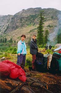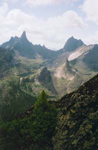 Спуск с перевала не представляет сложности, и до дна цирка спустились по травянистому склону за 10 минут. Далее тропа пересекает цирк. Достаточно четкая, маркированная турами. В лагерь вернулись в 18.50. Соседи, ребята из Москвы, вернее из Подмосковья, сходили, как и хотели, на пик Мать Саян. Рекомендовали и нам сходить туда же. Вечерком развели спирту и отметили с ребятами удачный день. Просидели у костра, болтая о всяком и вспоминая различные походы, до полуночи.