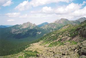 В цирке под горой Черепаха и пер. Сказка есть неплохая стоянка на одну палатку (GPS: 52 52,543; 93 21,985) на берегу ручья. Далее тропа пересекает ручей и идет к перевалу Сказка. Мы же по курумнику пошли напрямик к склонам "Черепахи". Пересекли его и поднялись к самой "голове Черепахи". У основания "головы" обнаружили уютный грот (груда камней, прикрытых сверху плоской плитой). Здесь, в случае чего, можно укрыться от непогоды (GPS: 52 52,543; 93 21,985). В этом месте мы были в 14.25.