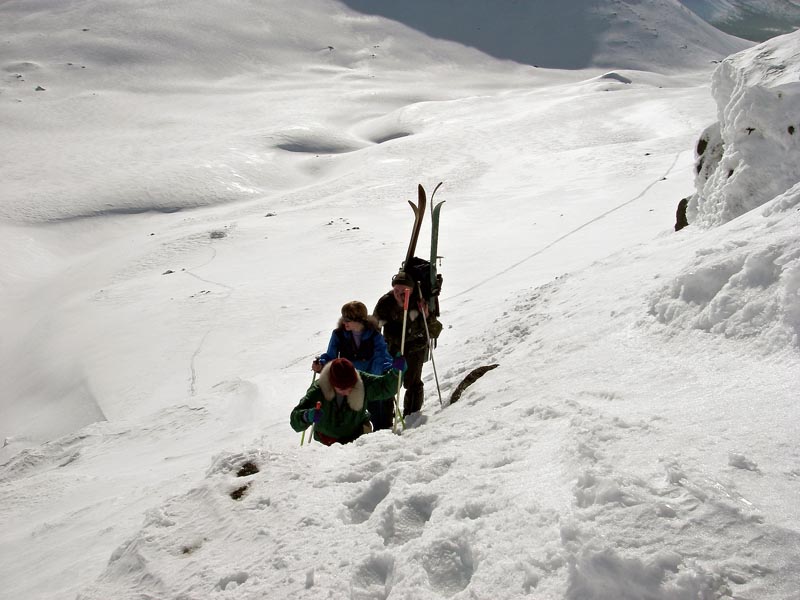 Часам к 12 начался подлип, но к этому времени мы уже поднялись под пер.Восточный Арсеньева и нам подлип был только на руку. Шли на перевал как на камусе.