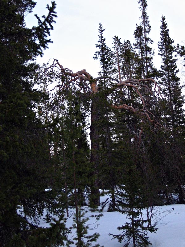 Это было шоу - карликовые березки дружно сменили елки. Макс ловко между ними маневрировал, но мы при этом дружно закапывались в ямах под этими елками. Я упала раз 100 наверное, наделала кучу "формочек", в основном носом вниз. Назвала это "фристайлом с рюкзаком", т.к. приходилось переворачиваться на спину, отстегивать рюкзак, выползать на него, потом выкапывать из-под снега лыжи и палки и вставать. Если бы не рюкзак, пришлось бы тяжко. Снег был мокрый и рыхлый, и мы были все мокрые. Короче сначала на мне ехал рюкзак, потом я лежала на рюкзаке и ноги с лыжами кверху :). Таким вот хитрым способом мы спускались часа 3, причем Макс, Ася, Маша и Андрюша еще ждали отставших минут 40. Где-то в 20.30 нашли-таки место с тремя сушинами и разбили лагерь.