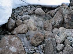 По пути видели большой лагерь (два шатра), но они еще спали и нас не видели. Где-то часов в 10 остановились на завтрак, как раз там, где лыжня переходила ручей, впадающий в Малую Белую. Погода теплая, солнышко, градусник показывает +5. Долго ли коротко ли, но, позавтракав гречневой кашкой, мы двинулись дальше.