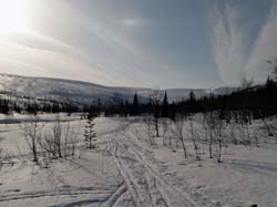 Где-то в 13.30 сели перекусить. И тут к нам подъехали трое "бомбардьеров". Мужики сразу осведомились - не налить ли нам :). Были они из Питера, и всем было лет по 40. Крутые тачки с оленьими шкурами. Нас конечно пожурили, что мы не заявляемся, ведь тут сходят лавины! Конечно ездят тут "бомбардьеры" как попало и подрезают склоны! :) Минут через 40 двинулись вниз, намазав лыжи. Катухи нет, лыжи едут плохо. Спустились до развилки ручьев, налево уходил ручей на Южный Партомчорр.