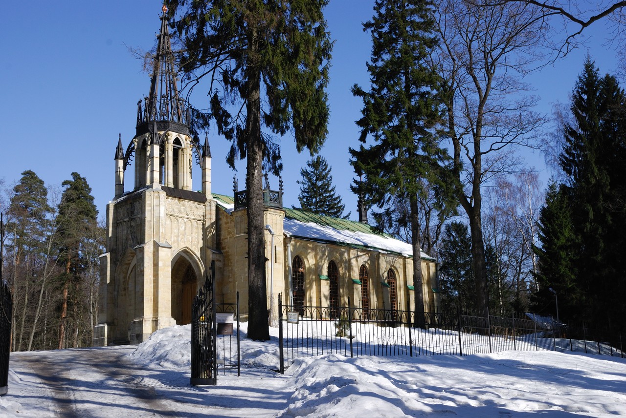 Геометрический центр парка - это находящийся в низине у подножия «горы» Парнас пруд, а точнее целый ряд прудов весьма причудливых форм (см. схему парка). Они были вырыты ещё в 18 веке. Обширный нижний пруд, трапецеидальный по конфигурации с полукружием в южной части, соединяется двумя каналами с расположенными по его сторонам малыми прямоугольными прудами и носит название «Рубаха Наполеона». Выше него еще один пруд — меньших размеров, отдаленно напоминающий по своим очертаниям треуголку и имеющий название «Шапка Наполеона». Названия прудов, очевидно, появились при третьем владельце имения — Павле Андреевиче Шувалове (1776–1823), участнике войны с Наполеоном, сопровождавшем в качестве представителя одной из победивших держав — России, низложенного французского императора в изгнание на остров Эльбу. На фотографии ниже - нижний пруд - "Рубаха Наполеона". Сейчас конец марта, но лёд ещё крепкий. Юго-восточнее пруда лежит подножие «горы» Парнас. Этот насыпной холм высотой 61 метр был создан руками крепостных графа Шувалова в середине 18 века. Название его связано с древнегреческой мифологией, где Парнас считался местом обитания бога Аполлона и муз. Сюда приезжали дачники любоваться восхитительным закатом солнца. С вершины горы, на которой была устроена специальная огороженная площадка со скамейками, был виден даже Финский залив. И сегодня с горы открывается отличный вид на город, точнее на панорому его северных новостроек. Ну а также отлично видны пруды. Зимой с этой вершины народ спускается на ватрушках. Правда, с самого верха спускаться немного стремновато и, как показала практика, весьма небезопасно. То ли в конце 80-х, то ли в начале 90-х в одном из подземных ходов в «Парнасе» (во время Великой Отечественной Войны в холме был вырыт командный пункт связи Ленинградского фронта), засыпало двоих детей, и в ходе спасательной операции часть «Парнаса» была срыта. Тем не менее, зимой и эта срытая часть холма весьма живописна. Можно даже заниматься ледолазанием :) В парке существует и множество менее крутых горок и горочек - истинное раздолье для детей. Ну а это Дмитрий Классное дерево И ещё одно А это игры с огнём тех самых ролевиков Чуть-чуть не попал в резкость, но зато чувствуется движение :). High Pass Filter помог немного вытянуть фотографию. И, наверное лучший кадр - очень удачно получился огонь. В парке достаточно много памятников архитектуры, правда большая часть из них, в том числе и Дворец расположена на огороженной решёткой территории ВНИИ токов высокой частоты им В.П. Вологдина, и не очень понятно, можно ли туда проникнуть. По крайней мере, надпись про собак весьма смущает. К тому же постройки сильно пострадали от времени и человеческого варварства. В частности, Дача Месмахера. У меня вот даже не возникло желания запечатлеть её на фото :( Но зато есть тут объект отреставрированный и свободный для посещения, настоящая жемчужина Шуваловского парка - Церковь Петра и Павла. Закладка церкви состоялась летом 1831 г. Ее строительство продолжалось долго – свыше 10 лет. Объяснить это можно материальным положением владельцев усадьбы. Из-за огромных долгов графини (послуживших причиной установления попечительства над имением) на строительство церкви отпускалось очень мало средств. Остается неизвестным, почему построенная к 1841 году церковь оставалась не о